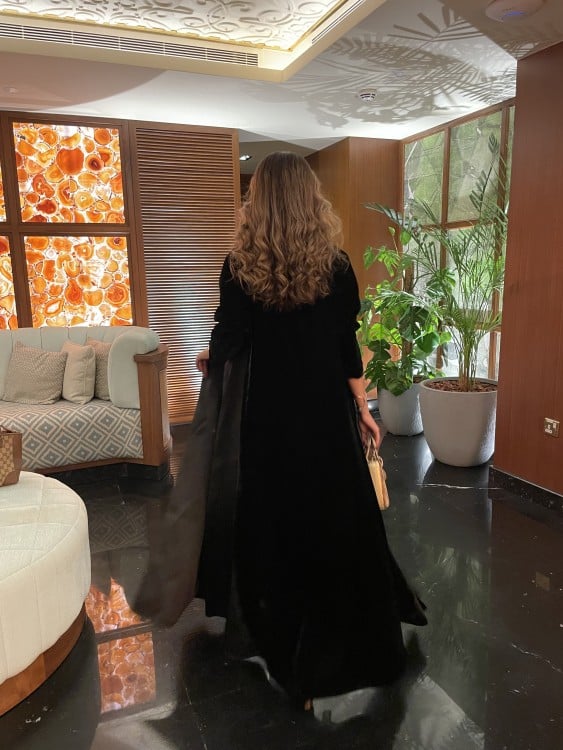 - عبايه قماش مخمل أسود قصة ربع كلوش جنب العبايه قماش تفتة مكيادو