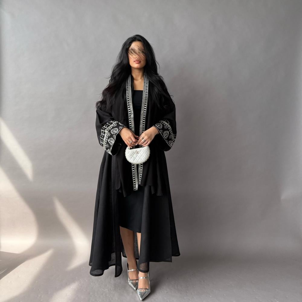 عباية بقماش لنن أسود بأكمام مطرزه ، قصة كلوش