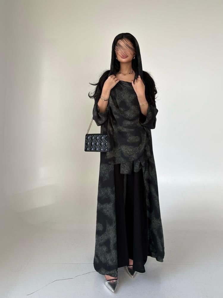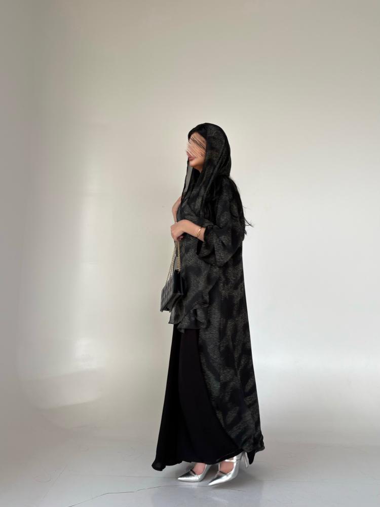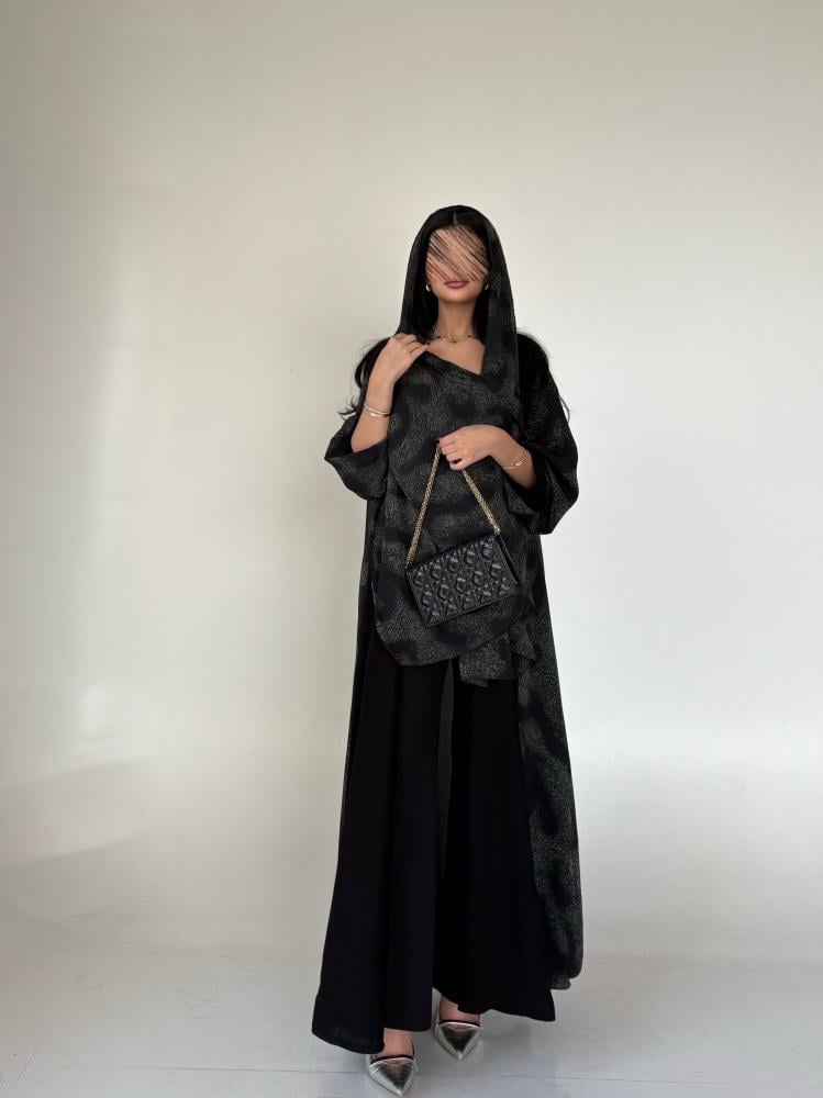 عبايه قماش شيفون هندي مبطن بطبعات خضراء قصة كلوش