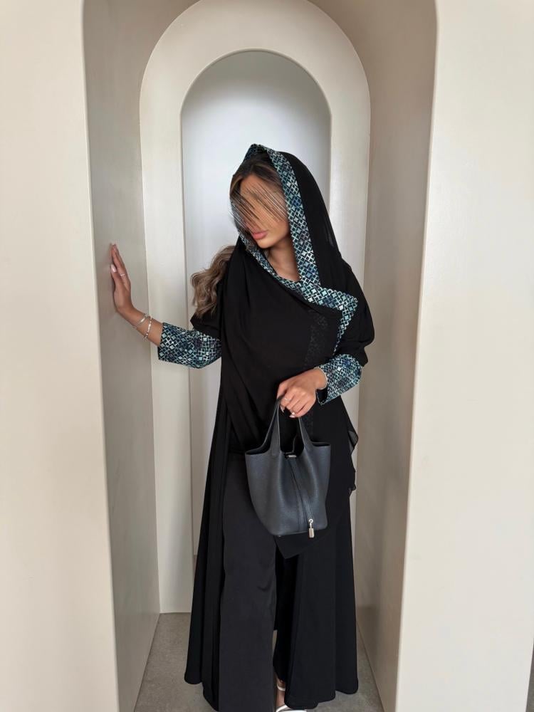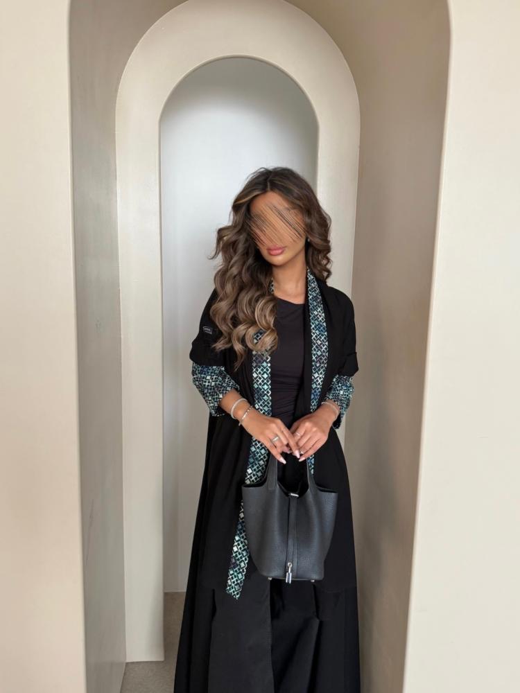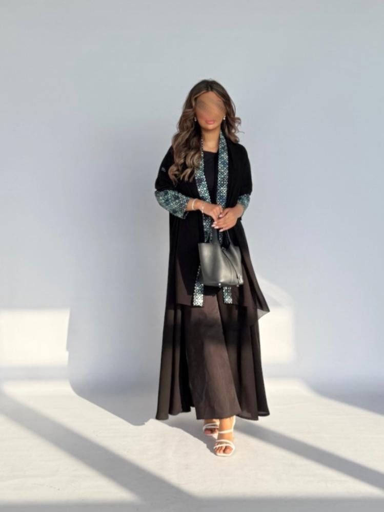 عبايه بقماش كريب اسود قصة كلوش بأكمام وطرف شيله تطريز هندي