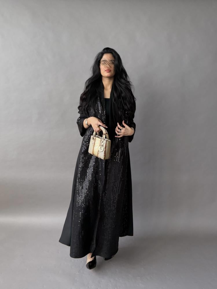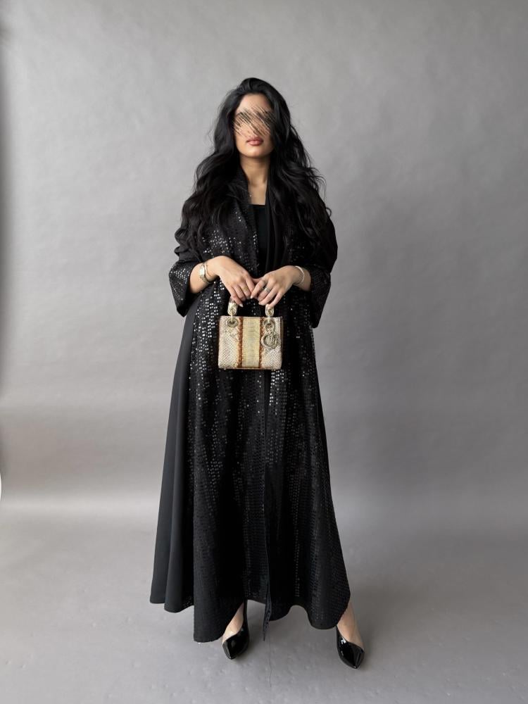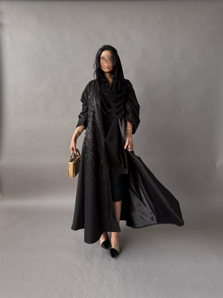 عباية بقماش تفته مطفي بمقدمه واكمام قابله للطوي بالترتر الاسود ، قصة نص كلوش
